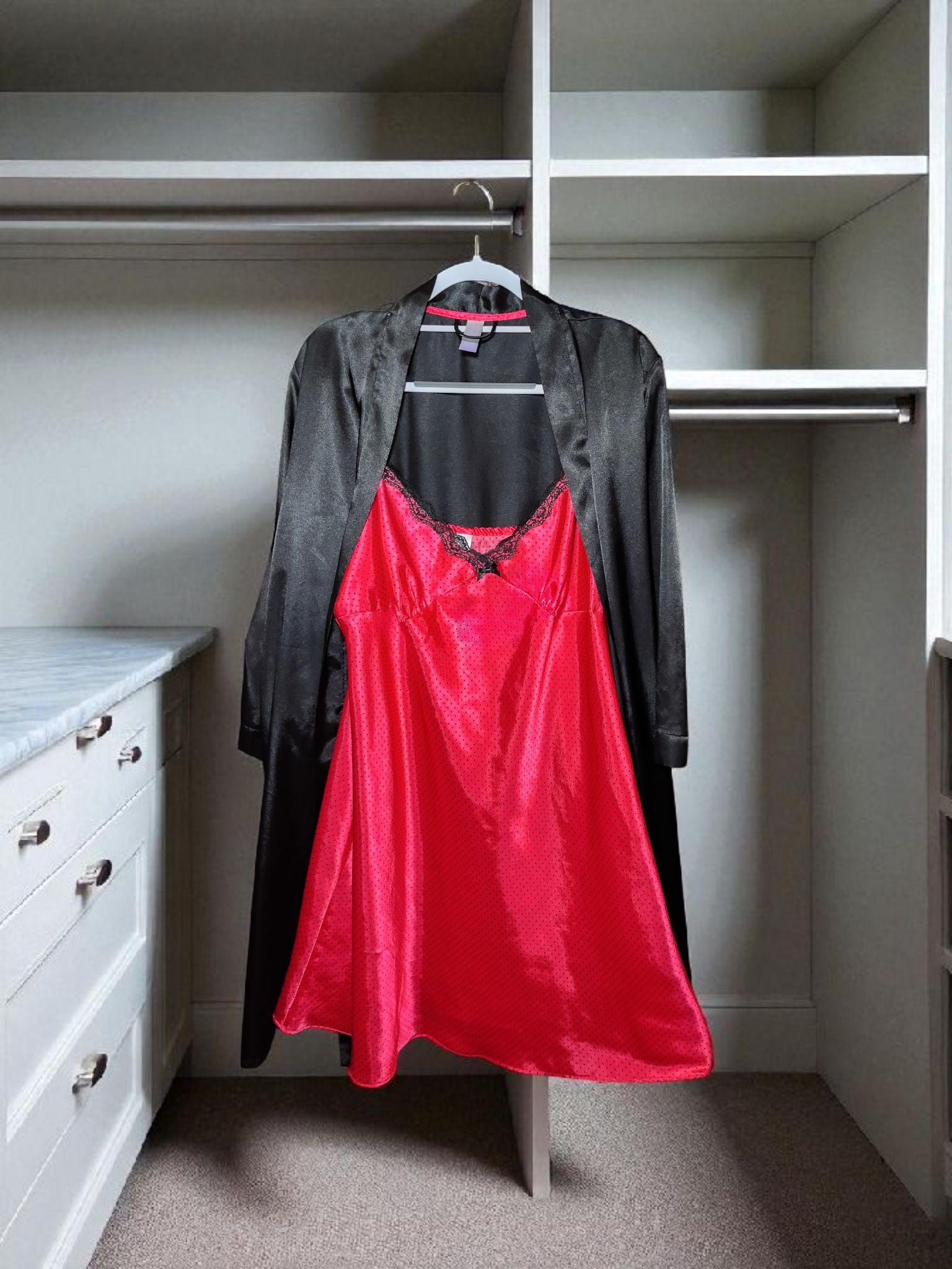 Black and red silky polka dot 2 piece pj. Top and Bottom